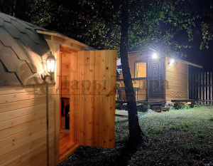 Дополнительный источник света в темное время суток, а также с подсветкой баня будет выглядеть еще более оригинальной.