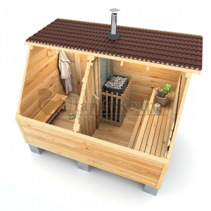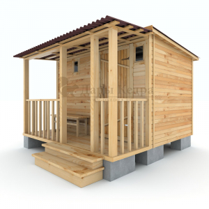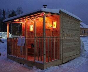 Это классическая прямоугольная модель бани с двумя отделениями: парилкой и раздевалкой. Для удобства пользования раздевалка оснащена лавочкой и вешалкой. Парилка оборудована двухуровневым открытым полком и печью. За счет небольшой конструкции баня нагревается в течении 30 минут. На просторной веранде можно оставить вещи или отдохнуть после парения. Каркасно-щитовую баню можно заказать как в готовом, так и в разборном варианте. В разборной модели готовые щиты из кедра быстро собираются в полноценное строение, что также позволяет исключить лишний строительный мусор. Такая баня не требует полноценный фундамент, поэтому при необходимости ее можно перенести в другое место.