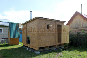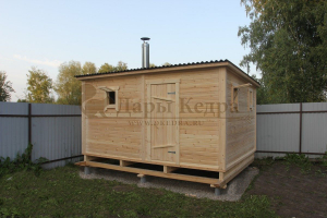Это квадратная классическая модель бани с тремя отделениями: предбанником, моечной и парилкой. Для удобства пользования предбанник оснащен лавочкой и вешалкой. В моечной находится лавка и полочка из кедра. Парилка оборудована двухуровневым открытым полком и печью. За счет небольших размеров баня нагревается не более 30 минут. Каркасно-щитовую баню можно заказать как в готовом, так и в разборном варианте. В разборной модели готовые щиты из кедра быстро собираются в полноценное строение, что также позволяет исключить лишний строительный мусор. Такая баня не требует полноценный фундамент, поэтому при необходимости ее можно перенести в другое место.