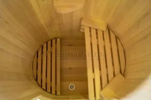 Овальная фитобочка из кедра - это мини парная, которую можно использовать не только в спа-салонах, но и дома. Овальная модель более просторна и удобна в использовании. Толщина стенок составляет 25 мм. Она оборудована откидными створками, дверцей и отверстием для головы. Во время парения человек сидит внутри кедровой бочки, а голова находится снаружи. Благодаря этому исключается возможность перегрева. Подлокотники из кедра, встроенные ручки на створках и двери делают эксплуатацию более удобной.