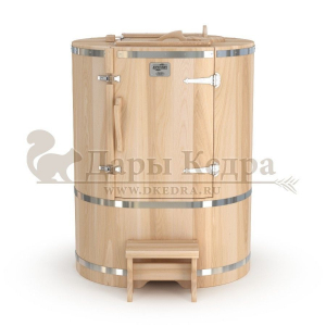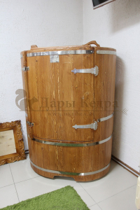 Готовый комплект - это полностью укомплектованный набор с фитобочкой для процедур парения. Овальная модель более просторна и удобна в использовании. Толщина стенок составляет 25 мм. Фитобочка оборудована откидными створками, дверцей и отверстием для головы. Во время парения человек сидит внутри кедровой бочки, а голова находится снаружи. Благодаря этому исключается возможность перегрева. Подлокотники из кедра, встроенные ручки на створках и двери делают эксплуатацию более удобной.