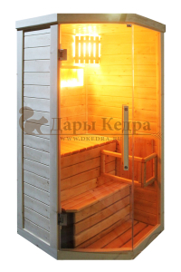 Финская сауна с электрокаменкой представляет собой компактную парную кабину, изготовленную из целебной древесины сибирского кедра. Финская