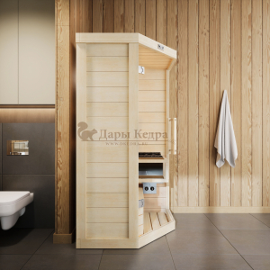 Это специально оборудованная готовая деревянная кабина для сухого и влажного парения. Электропечь нагревает пространство внутри и позволяет сбрызгивать камни водой, слегка увлажняя воздух. Такая процедура позволяет избежать перегрева. Каркас сауны выполнен из массива кедра, снаружи и внутри обшит липовой вагонкой сорта «Экстра» и имеет теплоизоляционный слой. Также двухуровневый полок идёт из кедра для обогащения внутри кабины полезными фитонцидами, а в сочетании с противовирусными свойствами липы сауна становится настоящим источником здоровья.