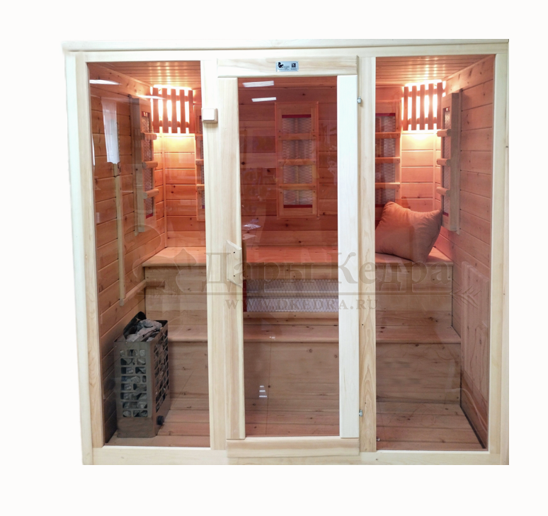 Трехместная комбинированная сауна из кедра с электрокаменкой Данную модель можно использовать как инфракрасную кабину, так и финскую сауну. Керамические нагреватели отвечают за сухое тепло. Они излучают инфракрасные лучи, которые равномерно прогревают тело человека. Электрическая печь нагревает кабину изнутри и позволяет сбрызгивать камни водой, слегка увлажняя воздух. Цилиндрический парообразователь применяется вместе с электропечью и служит для повышения влажности и образованию пара в сауне. Является доп опцией и оплачивается отдельно! Поочередно используя разные типы нагревателей можно усилить процесс очищения организма. Таким образом, шлаки удаляются как из внешних слоев кожи, так и из внутренних тканей.