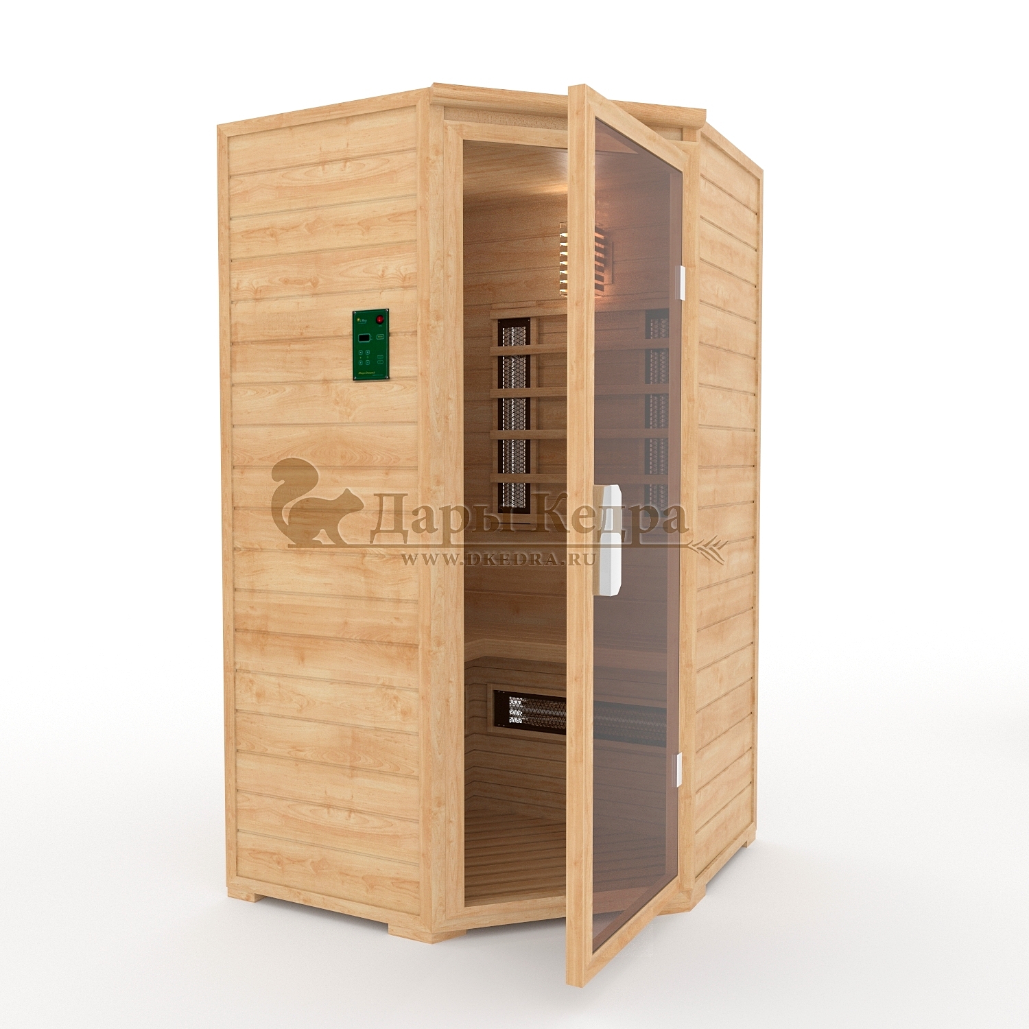 Одноместная угловая инфракрасная сауна кабина из кедра с керамическими излучателями Это специально оборудованная кедровая кабина для прогрева тела человека сухим теплом. Воздух в таких парных не нагревается. Инфракрасные лучи воздействуют на тело, равномерно прогревая мышцы, суставы и органы. Керамические излучатели похожи на лампы, имеют высокую температуру нагрева, поэтому защищены противоожоговыми решетками. Тело человека в таких саунах нагревается интенсивнее. Работает кабина за счет электричества. Установка сауны в угол, позволяет рационально использовать пространство помещения. Подходит как для домашнего использования, так и для коммерции. Обращаем Ваше внимание что в стандартную комплектацию входит трапик для ног, но вы можете его заменить на цельный пол совершенно бесплатно! Целебная древесина кедра и инфракрасные лучи благотворно влияют на организм человека в целом. При регулярном использовании инфракрасной сауны укрепляется иммунитет, улучшается кровообращение и состояние кожи, выводятся токсины.