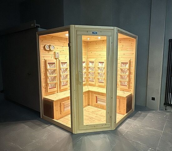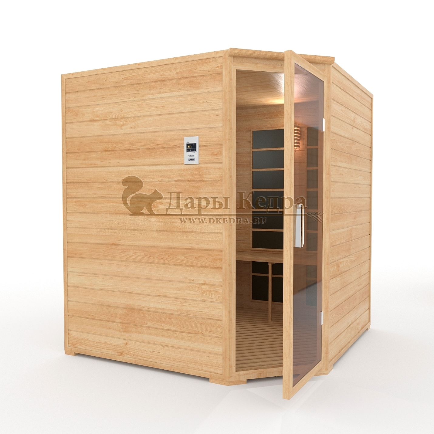 Четырёхместная угловая инфракрасная сауна кабина из кедра с керамическими излучателями Это специально оборудованная кедровая кабина для прогрева тела человека сухим теплом. Воздух в таких парных не нагревается. Инфракрасные лучи воздействуют на тело, равномерно прогревая мышцы, суставы и органы. Керамические излучатели похожи на лампы, имеют высокую температуру нагрева, поэтому защищены противоожоговыми решетками. Тело человека в таких саунах нагревается интенсивнее. Работает кабина за счет электричества. Установка сауны в угол, позволяет рационально использовать пространство помещения. Подходит как для домашнего использования, так и для коммерции. Обращаем Ваше внимание что в стандартную комплектацию входит трапик для ног, но вы можете его заменить на цельный пол совершенно бесплатно! Целебная древесина кедра и инфракрасные лучи благотворно влияют на организм человека в целом. При регулярном использовании инфракрасной сауны укрепляется иммунитет, улучшается кровообращение и состояние кожи, выводятся токсины.