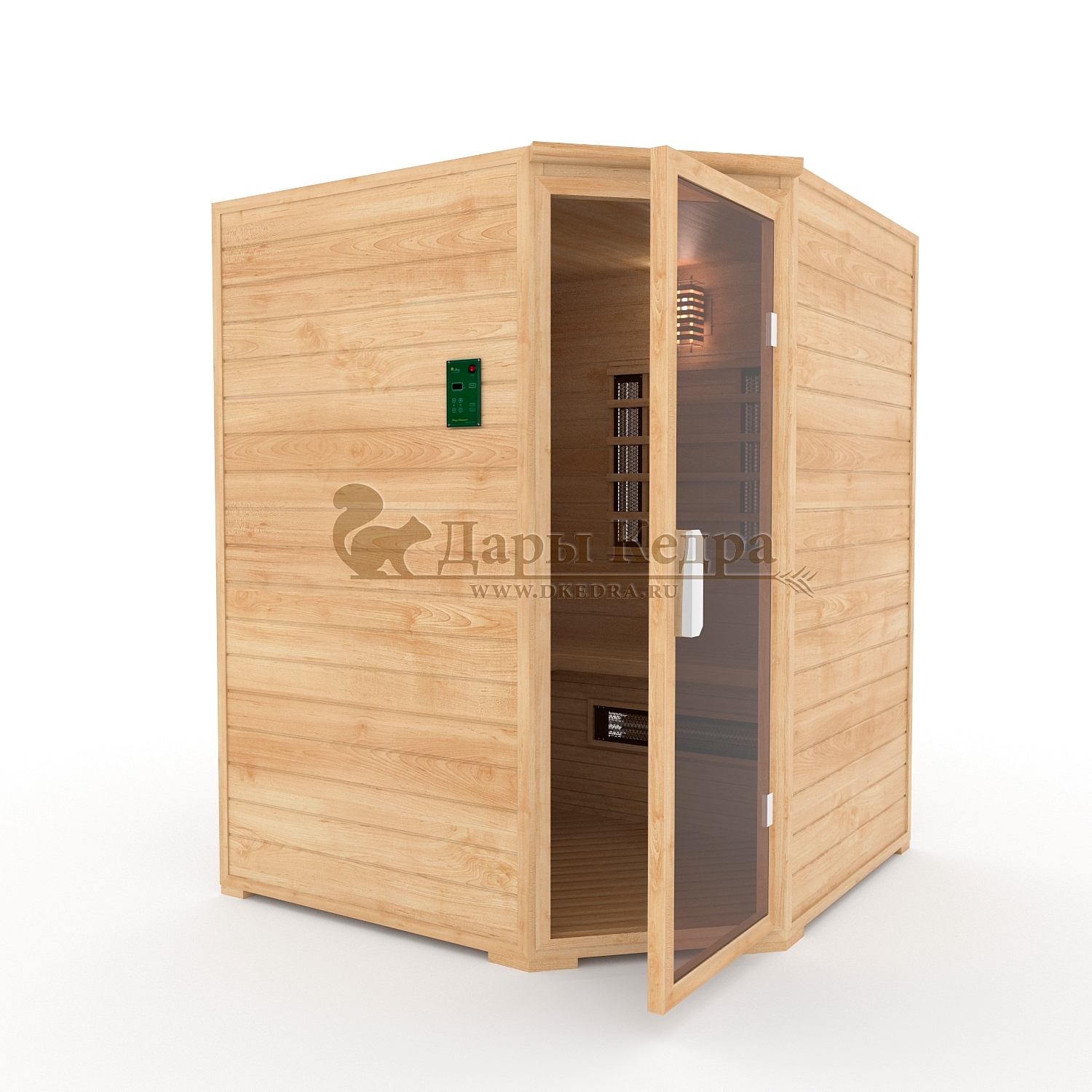 Трёхместная угловая инфракрасная сауна кабина из кедра с керамическими излучателями Это специально оборудованная кедровая кабина для прогрева тела человека сухим теплом. Воздух в таких парных не нагревается. Инфракрасные лучи воздействуют на тело, равномерно прогревая мышцы, суставы и органы. Керамические излучатели похожи на лампы, имеют высокую температуру нагрева, поэтому защищены противоожоговыми решетками. Тело человека в таких саунах нагревается интенсивнее. Работает кабина за счет электричества. Установка сауны в угол, позволяет рационально использовать пространство помещения. Подходит как для домашнего использования, так и для коммерции. Обращаем Ваше внимание что в стандартную комплектацию входит трапик для ног, но вы можете его заменить на цельный пол совершенно бесплатно! Целебная древесина кедра и инфракрасные лучи благотворно влияют на организм человека в целом. При регулярном использовании инфракрасной сауны укрепляется иммунитет, улучшается кровообращение и состояние кожи, выводятся токсины.