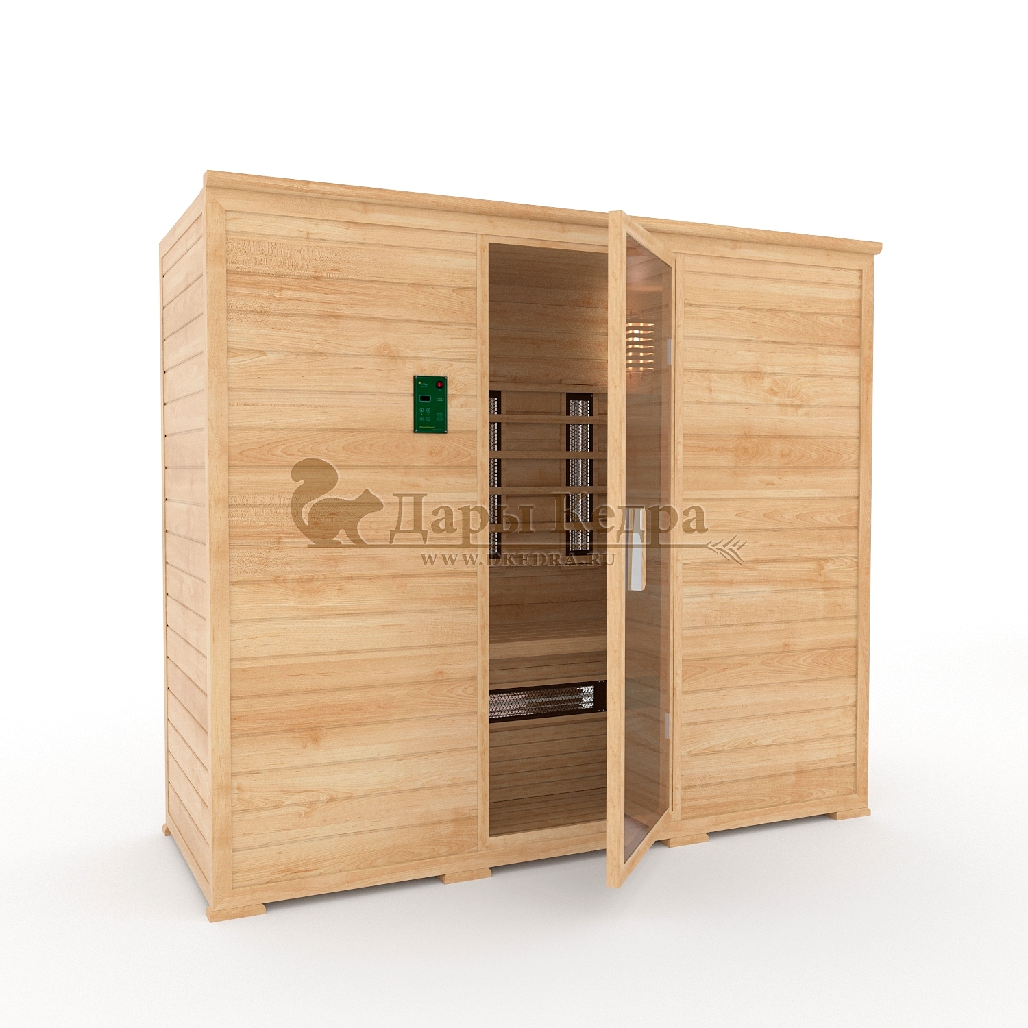 Пятиместная инфракрасная сауна кабина из кедра с керамическими излучателями Это специально оборудованная кедровая кабина для прогрева тела человека сухим теплом. Воздух в таких парных не нагревается. Инфракрасные лучи воздействуют на тело, равномерно прогревая мышцы, суставы и органы. Керамические излучатели похожи на лампы, имеют высокую температуру нагрева, поэтому защищены противоожоговыми решетками. Тело человека в таких саунах нагревается интенсивнее. Работает кабина за счет электричества. Вместительная пятиместная инфракрасная сауна с керамическими излучателями подойдет для коммерческого использования. Обращаем Ваше внимание, что в стандартную комплектацию входит трапик для ног, но вы можете его заменить на цельный пол совершенно бесплатно! Целебная древесина кедра и инфракрасные лучи благотворно влияют на организм человека в целом. При регулярном использовании инфракрасной сауны укрепляется иммунитет, улучшается кровообращение и состояние кожи, выводятся токсины.